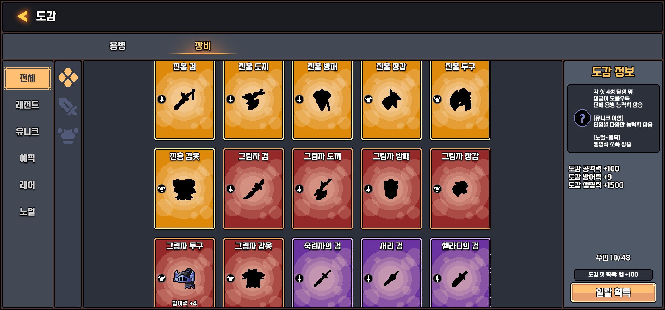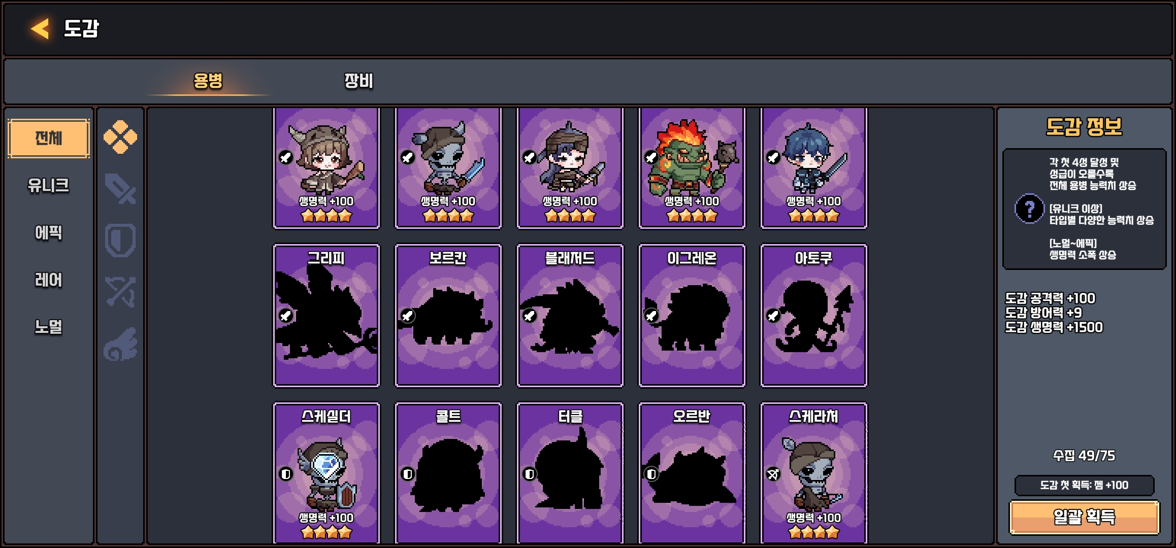 하지만 픽셀용병단은 도감 UI와 일러스트가 깔끔하게 정돈되어 있어서 캐릭터를 하나씩 모으는 과정 자체가 즐거운 요소로 작동합니다. 단순한 시스템이지만, 수집형 RPG의 핵심 매력은 오히려 더 선명하게 느껴져요.