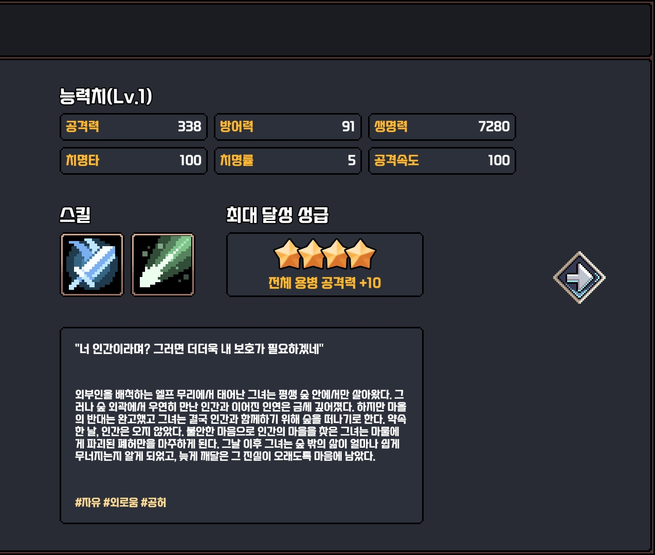 픽셀용병단의 스탯은 복잡한 요소를 모두 걷어내고, 딱 게임에 필요한 것만 남겨두었습니다.